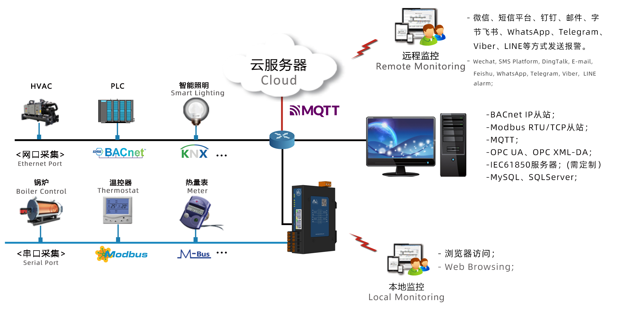 | -支持采集Modbus协议和BACnet协议转为BACnet服务器、Modbus服务器、IEC61850服务器(需定制)、OPC UA服务器、MQTT服务器; |