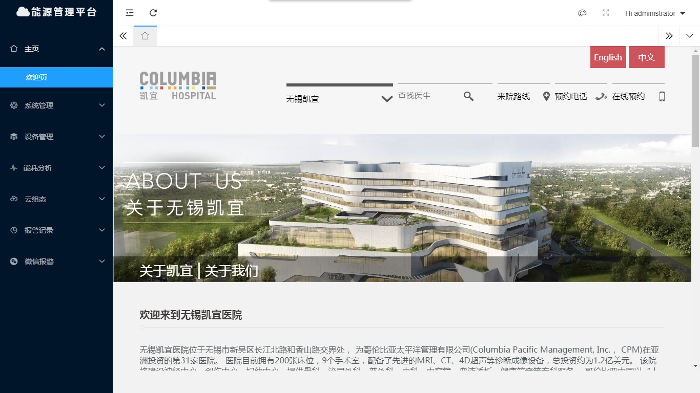 无锡凯宜医院位于无锡市新吴区长江北路和香山路交界处, 为哥伦比亚太平洋管理有限公司(Columbia Pacific Management, Inc., CPM)在亚洲投资的第31家医院。 医院目前拥有200张床位,9个手术室,配备了先进的MRI、CT、4D超声等诊断成像设备,总投资约为1.2亿美元。 该院将建设神经中心、创伤中心、妇幼中心,提供骨科、泌尿外科、普外科、内科、内窥镜、血液透析、健康筛查等专科服务。 哥伦比亚中国以“人员、质量、创新和诚信”为理论基础,致力于提供“以患者为中心”的高质量服务,同时,将遵守JCI标准,以支持医疗需求和社区的成长和发展。 一、设计原则 数据集成监控系统集自动化控制技术、计算机网络技术于一体,可同时集中或独立控制多台末端设备的开启、温度控制、阀体的开启等。在上位机的彩色动感操作界面上可以监控到每台末端的运行状态、手/自动启停、运行时间累计等,并对这些状态加以控制,达到节能的效果。 数据集成监控系统改变了只有采用DDC控制系统才能达到末端集中监控、联机到电脑的局面,节约了大量的施工成本及后期运营成本,符合现时代节能的需求。 二、系统配置方案 本系统需配备本地能源管理平台 1 套。还需配备WEB组态网关HMI2004-A9。网关又具有很强的互连功能,用于延伸RS485工业总线,开辟支线,变换网络的拓扑结构。考虑到施工及布线方面的限制,所以本系统推荐选用 X 台网关。 三、系统结构图