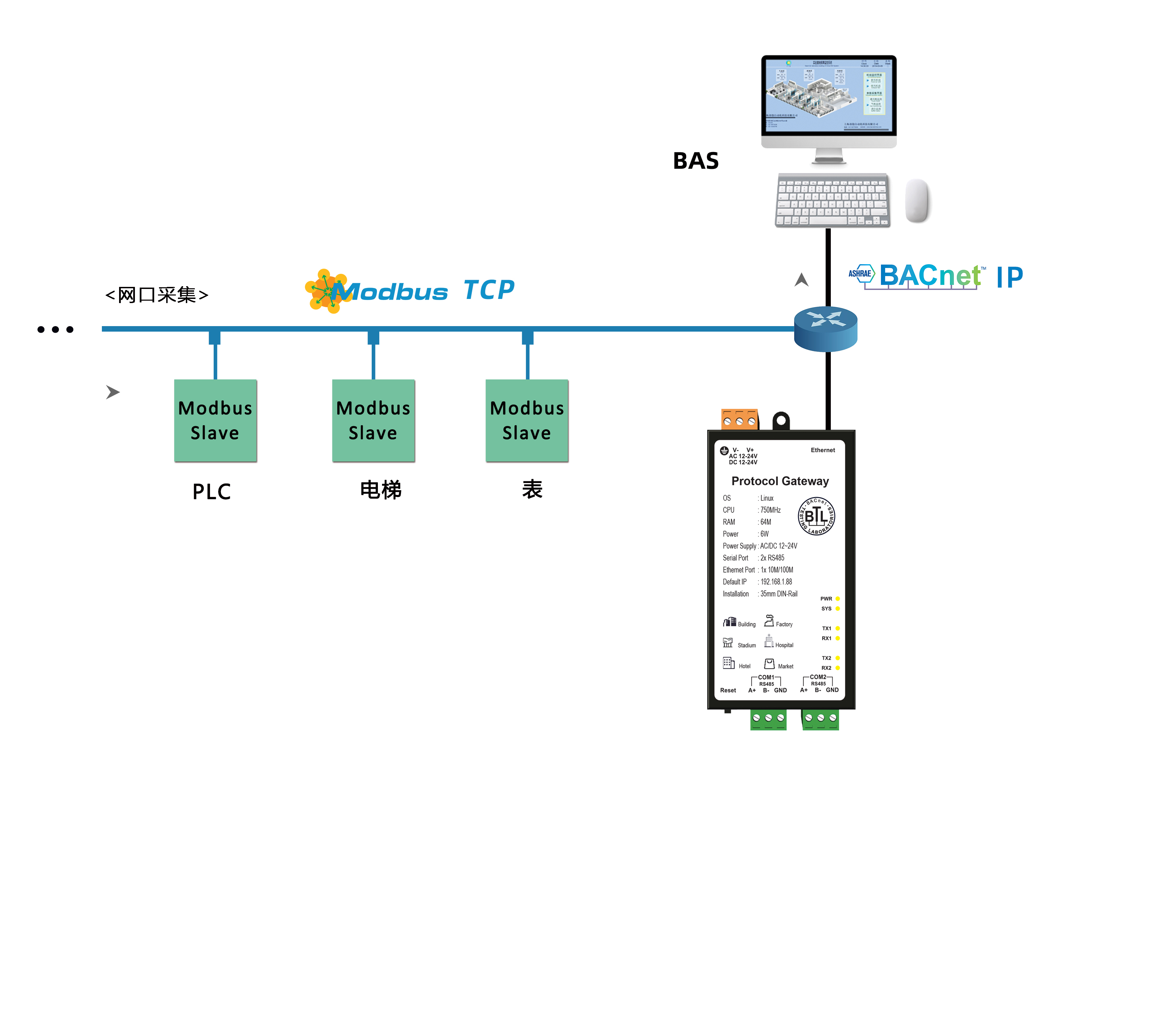 用于解决Honeywell,西门子,江森的Metasys、霍尼的EBI或者Niagara、施耐德TAC、加拿大Delta的ORCAview等大型楼宇自控公司组态软件无法连接一些不常见的控制设备,如PLC、空调、电梯、消防、灯光控制系统、电表、水表等。