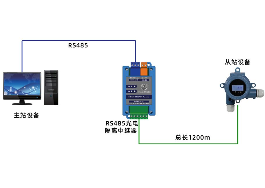 点对点:连接一个485输出设备,通讯距离延长1200m。